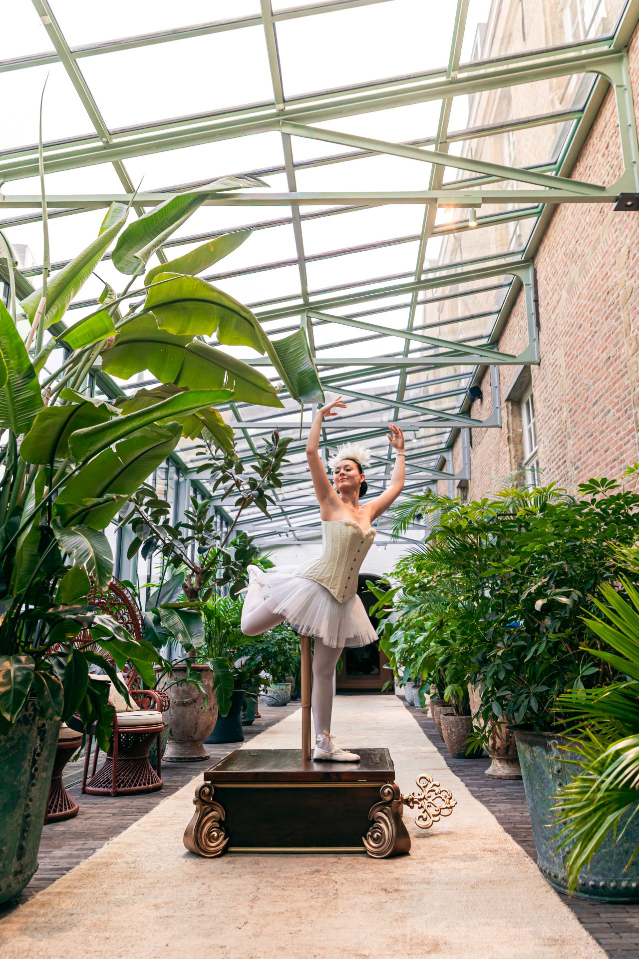 De combinatie van elegante witte ballerina's met een klassiek muziekdoosje creëert een stijlvolle en unieke eyecatcher. Het muziekdoosje is volledig personaliseerbaar, waardoor elke performance perfect aansluit bij de sfeer en identiteit van jouw event.